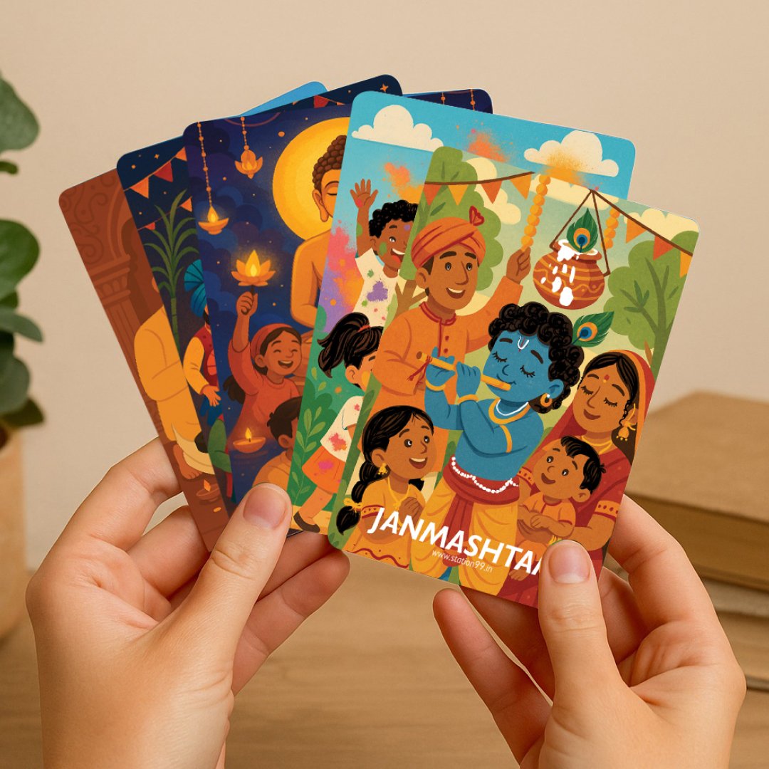 A 25-card tribute to India’s most cherished festivals — Hindu, Muslim, Christian, Sikh, and more. Illustrated with warmth, and paired with stories that spark nostalgia and pride. A perfect gift for mindful learning and soulful celebration.