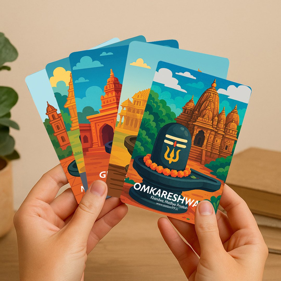 A 12-card spiritual journey through India’s revered Jyotirlingas — each card adorned with divine illustrations and temple lore. Crafted for seekers, learners, and soulful collectors.